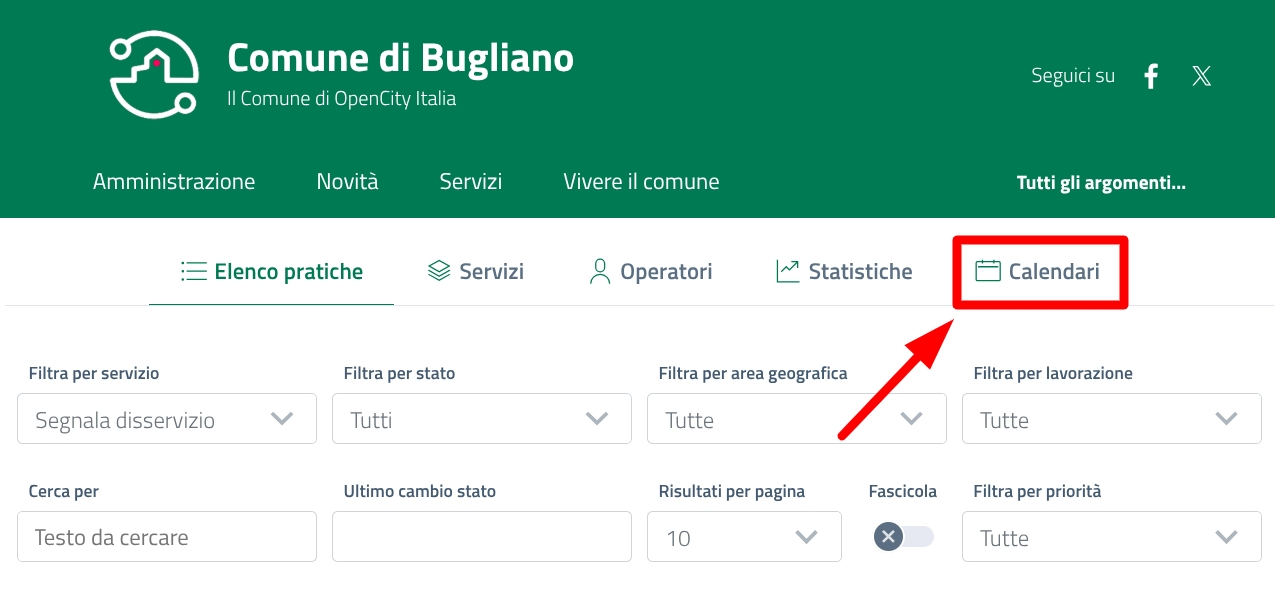 Per gestire gli appuntamenti, l'operatore accede alla piattaforma e seleziona la pagina "Calendari".