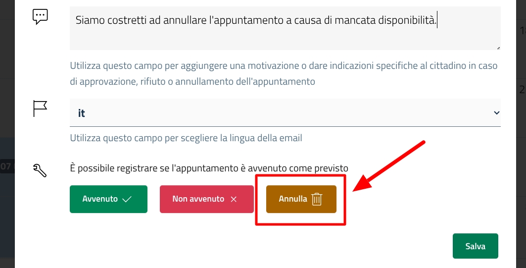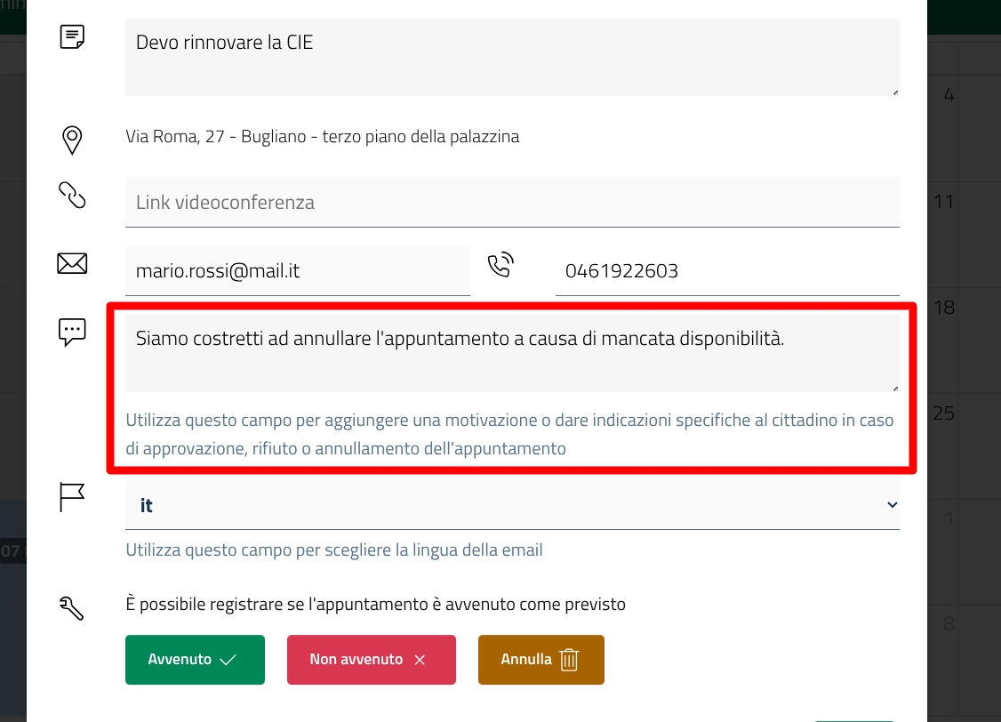 In caso di annullamento, puoi inserire un messaggio personale al cittadino.