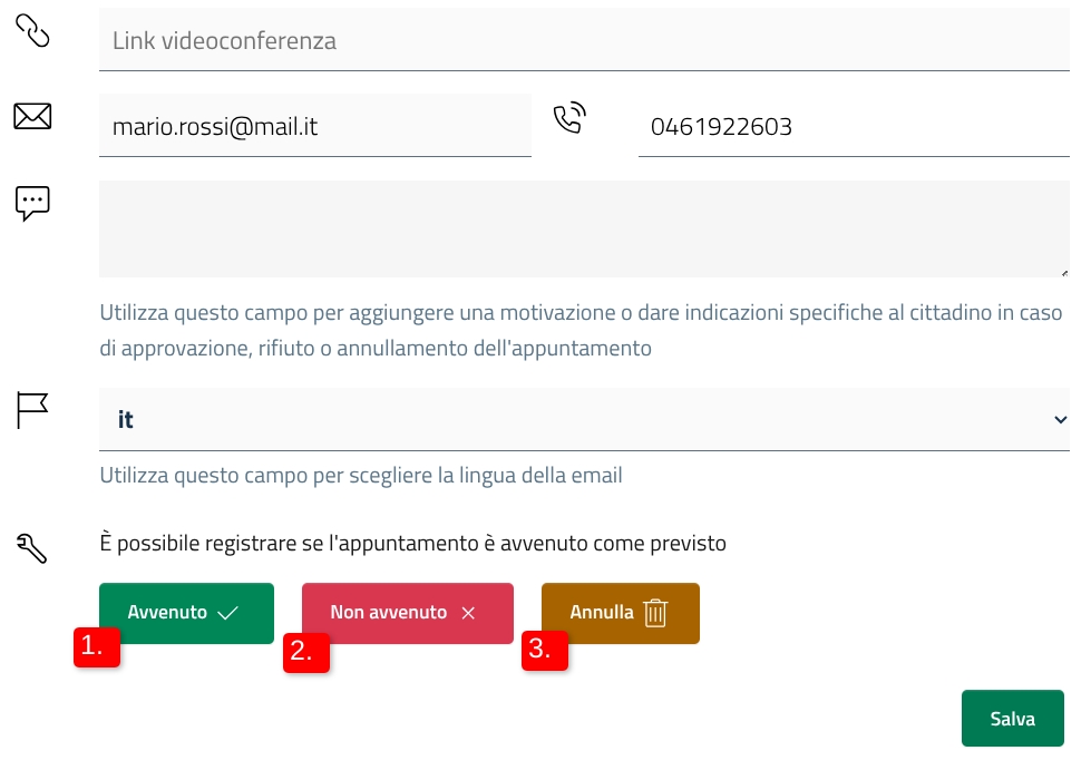 indicare l'appuntamento come "Non avvenuto" (2), che prenderà il colore rosso;