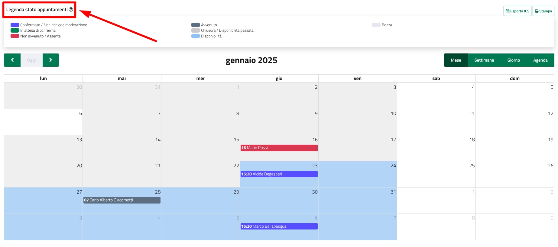 Disponi di una legenda che ti aiuta a riconoscere il significato dei vari colori, raggiungibile dalla voce "Legenda stato appuntamenti".
