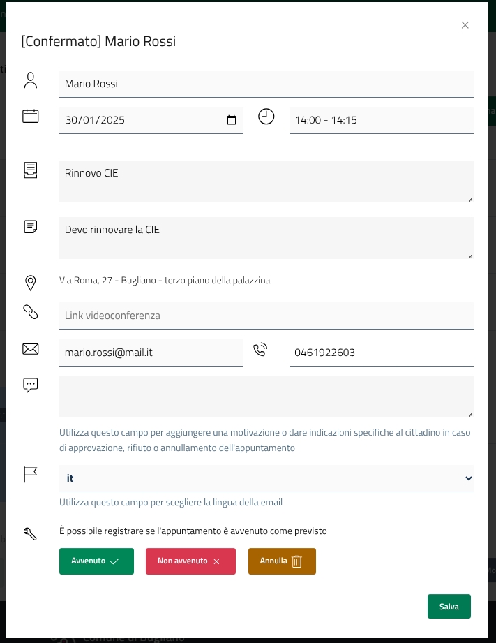 Facendo clic su uno degli appuntamenti puoi vedere i dati relativi l’appuntamento, inseriti dal cittadino in fase di compilazione.