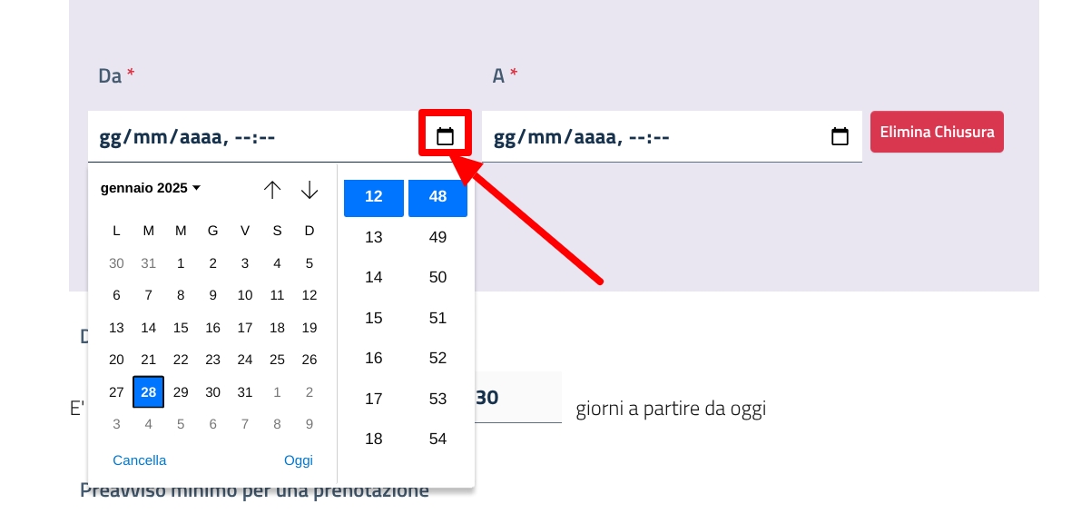 Indica da quando e fino a quando ha durata il periodo di chiusura. Puoi inserire manualmente data e orario, oppure usare il selettore a forma di calendario; in questo modo, si aprirà una finestra in cui selezionare il giorno e l' ora.