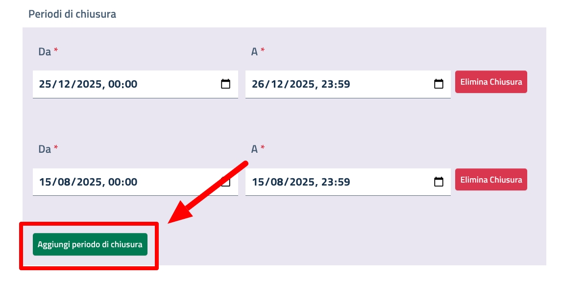 Per aggiungere un nuovo periodo di chiusura, clicca su "Aggiungi periodo di chiusura".