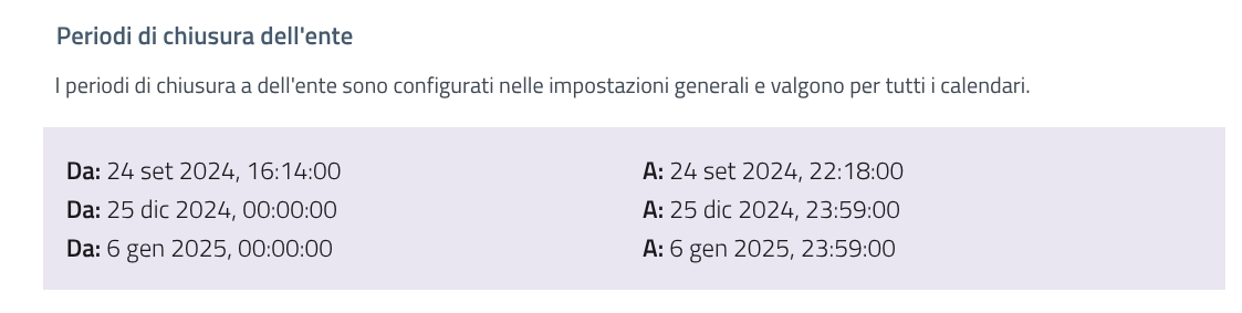 La funzione ti permette di gestire in anticipo giorni o periodi di chiusura come festività nazionali, feste patronali o semplicemente periodi in cui l'ufficio non prevede di gestire degli appuntamenti.