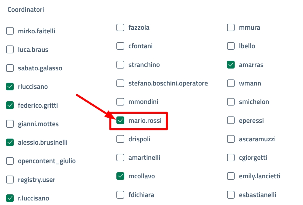 gli operatori abilitati al calendario: in ogni calendario trovi una lista con tutti gli operatori della piattaforma. Per abilitarne uno alla gestione degli appuntamenti e alla configurazione del calendario, clicca sulla checkbox alla sinistra del nome;