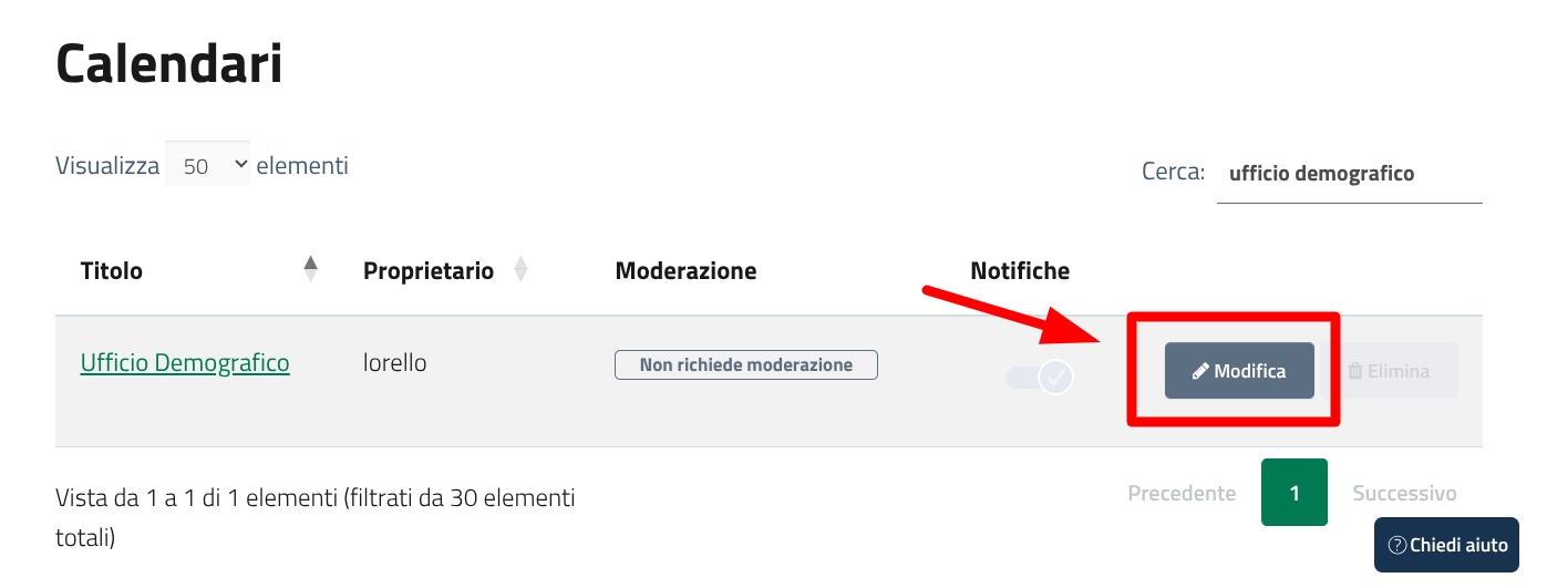 Per configurare un calendario, clicca sull'opzione "Modifica" a destra.