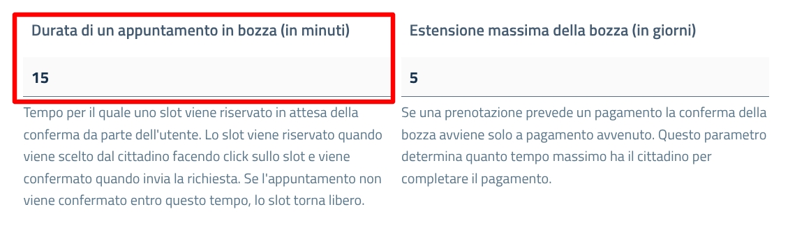 la durata della bozza, in minuti. Superati i minuti indicati, la bozza viene automaticamente cancellata e lo slot torna ad essere libero;