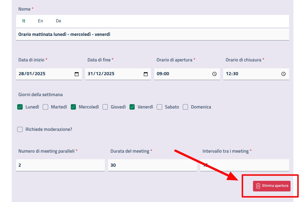 Puoi cancellare un orario di apertura cliccando sull'opzione "Elimina apertura"