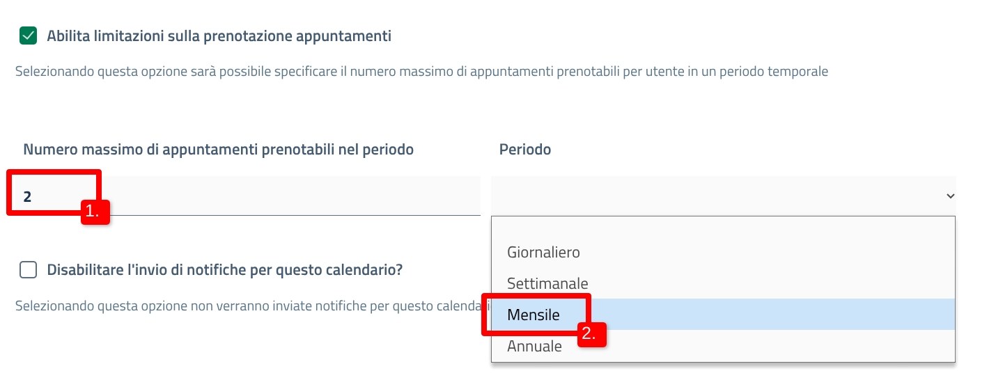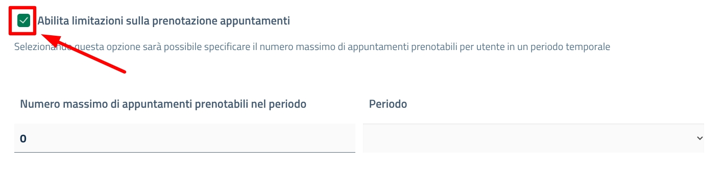 Durante la configurazione del calendario puoi attivare la funzione di limitazione degli appuntamenti cliccando sul checkbox.