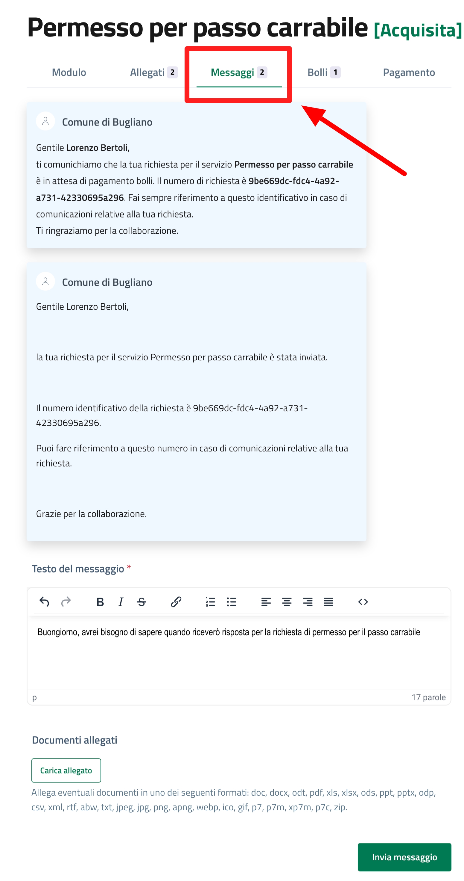 Nella sezione "Messaggi" della pratica, il cittadino può inoltrare dei messaggi all'operatore che ha in carico la pratica ed eventualmente inviare dei documenti allegati.