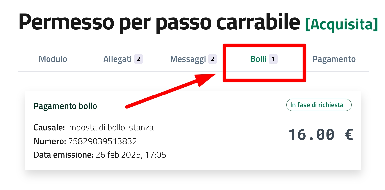 Nel caso di pagamento di marche da bollo, il cittadino può visualizzare la tipologia di bollo previsto dal servizio, la causale, il numero della marca da bollo e la data di emissione.
