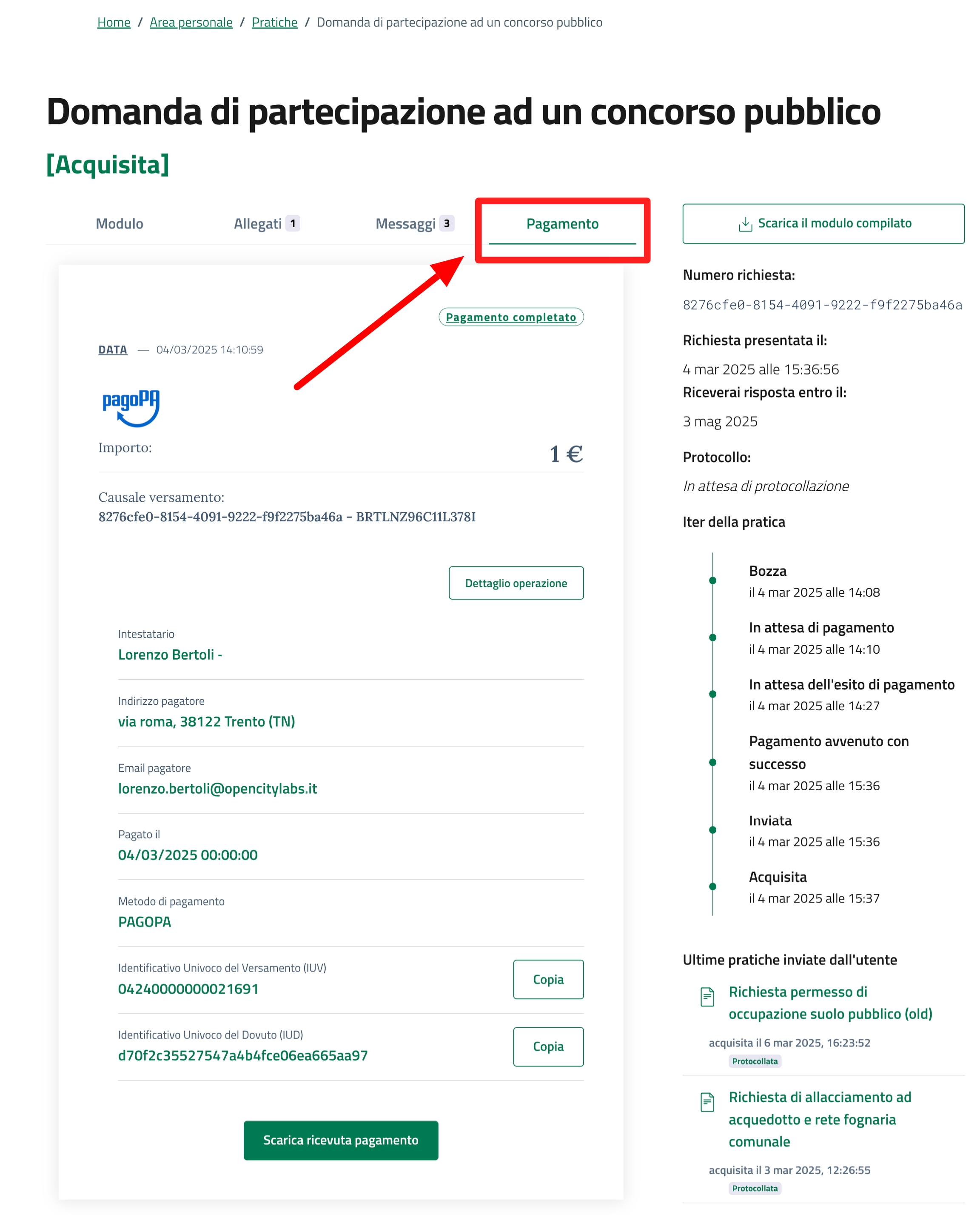Nel caso in cui il servizio preveda un pagamento, all’interno della pratica il cittadino avrà a disposizione una sezione dedicata ai pagamenti e/o ai bolli.