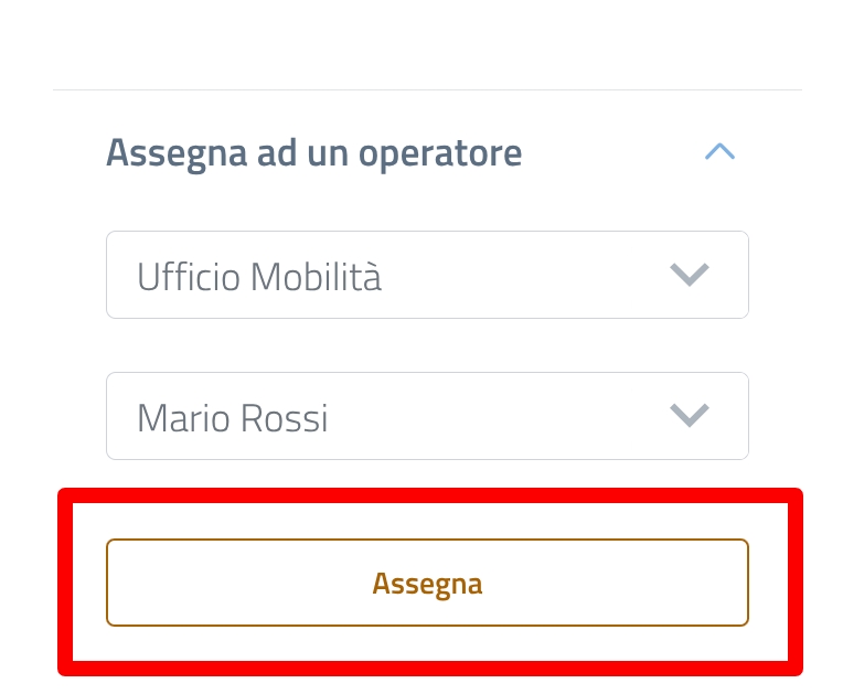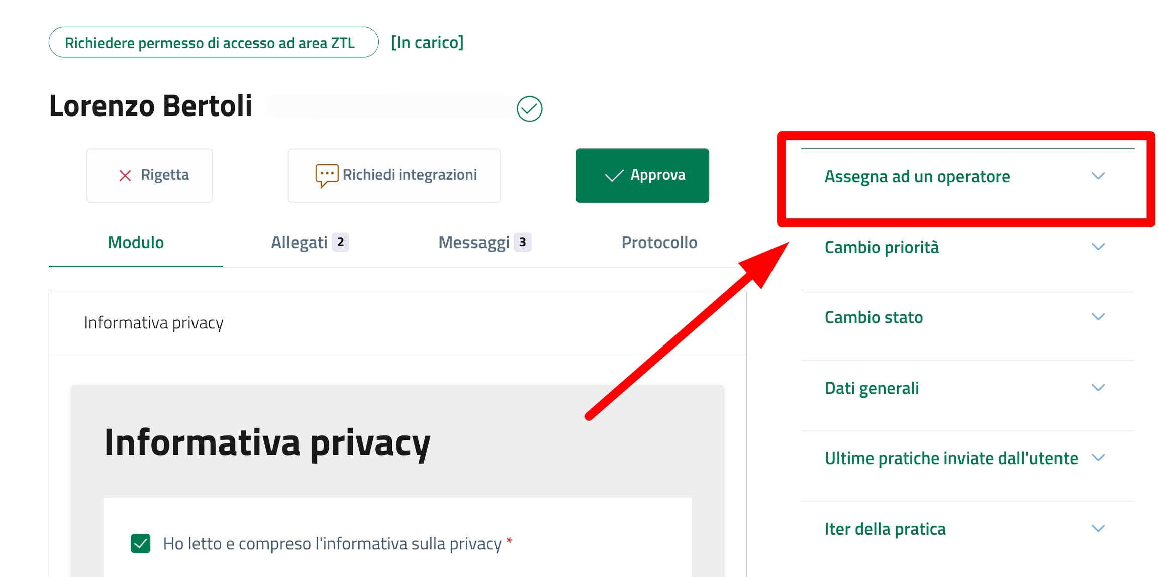 Per assegnare la pratica ad un altro operatore clicca su "Assegna ad un operatore"
