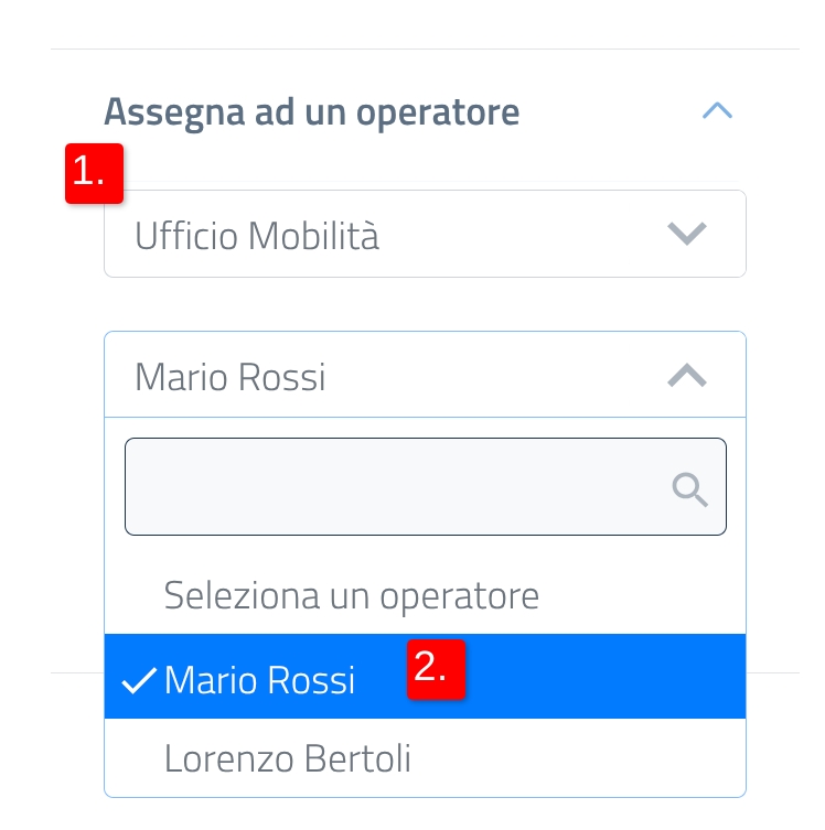 Dal menù a tendina seleziona l'ufficio (1) e l'operatore (2) a cui assegnare la pratica (1)