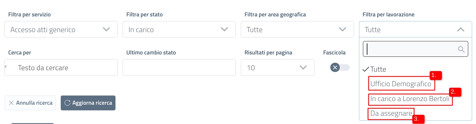 Con il filtro per lavorazione puoi recuperare le pratiche: