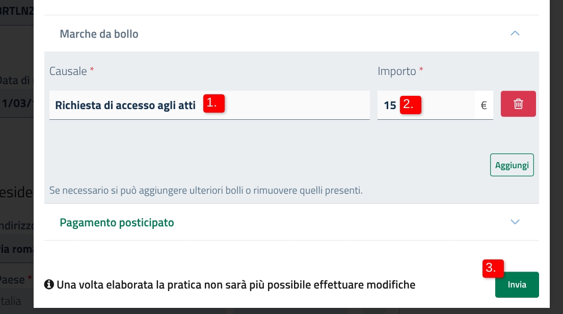 Una volta inserita una o più marche da bollo, indica la causale (1) e l'importo (2). Per inoltrare la richiesta di pagamento, clicca su "Invia" (3)