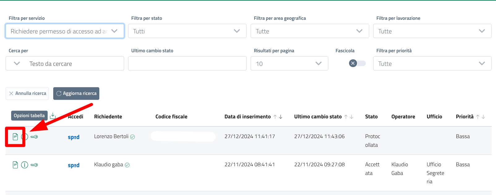 Dopo aver ricercato la pratica che vuole lavorare, l'operatore la seleziona e la prende in carico