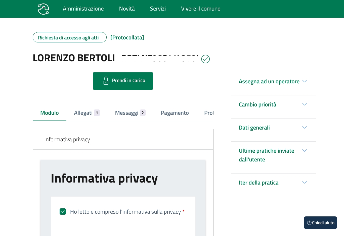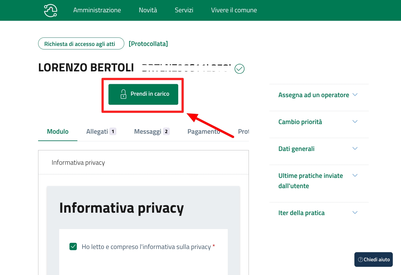 Clicca sul pulsante "Prendi in carico" per prendere in carico la pratica.