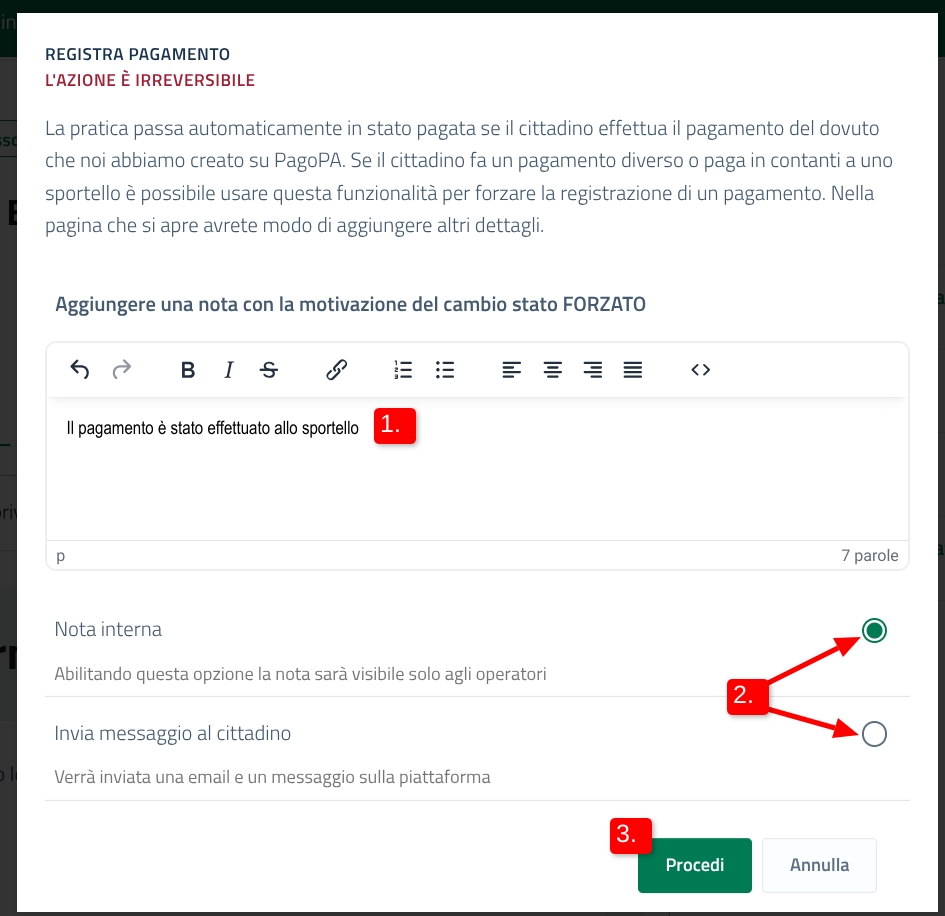 Durante la registrazione del pagamento, puoi aggiungere una motivazione (1), da salvare come come nota interna o da inoltrare come messaggio al cittadino (2). Una volta fatto, clicca su "Procedi" (3).