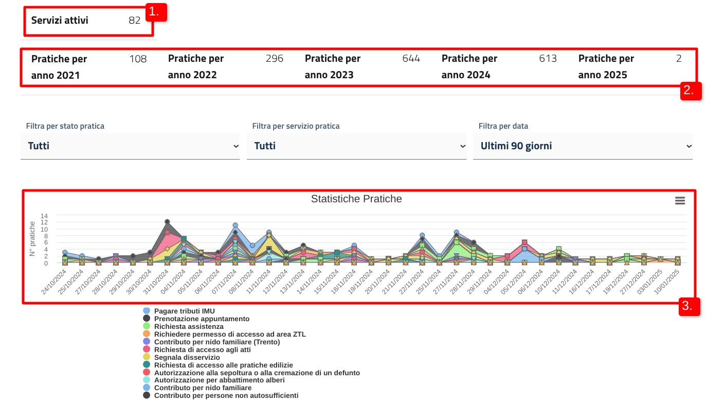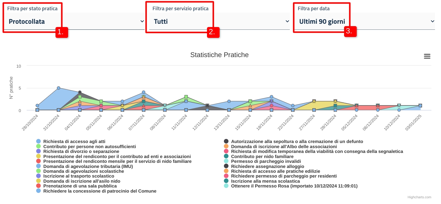 All'interno del grafico, puoi filtrare l'andamento delle pratiche per stato di lavorazione (1) e per servizio digitale (2). Puoi anche indicare uno specifico periodo di tempo (3).