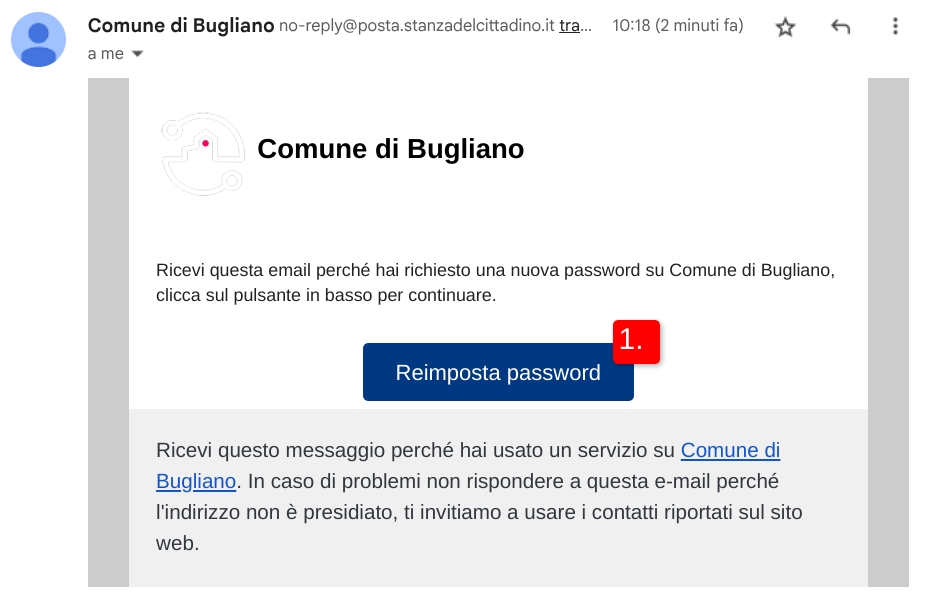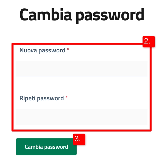 All'indirizzo mail indicato viene inviata una notifica di cambio password. Cliccando su "Reimposta password" (1), l'operatore viene rimandato ad una schermata dove dovrà inserire quella nuova (2). Per confermare, l'operatore clicca su "Cambia password" (3).