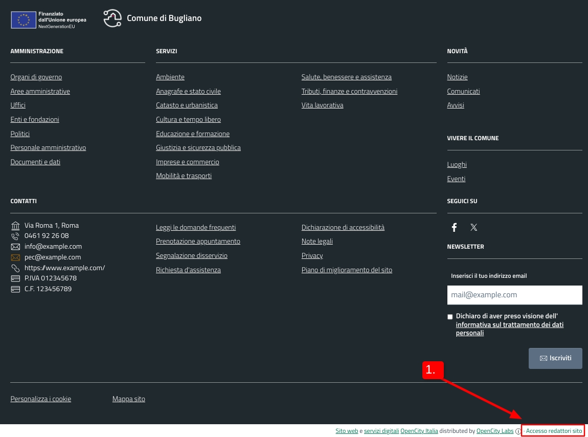 In caso di utilizzo del sistema di autenticazione nativo, l’accesso alla piattaforma avviene attraverso un link di accesso collocato nel footer (1).