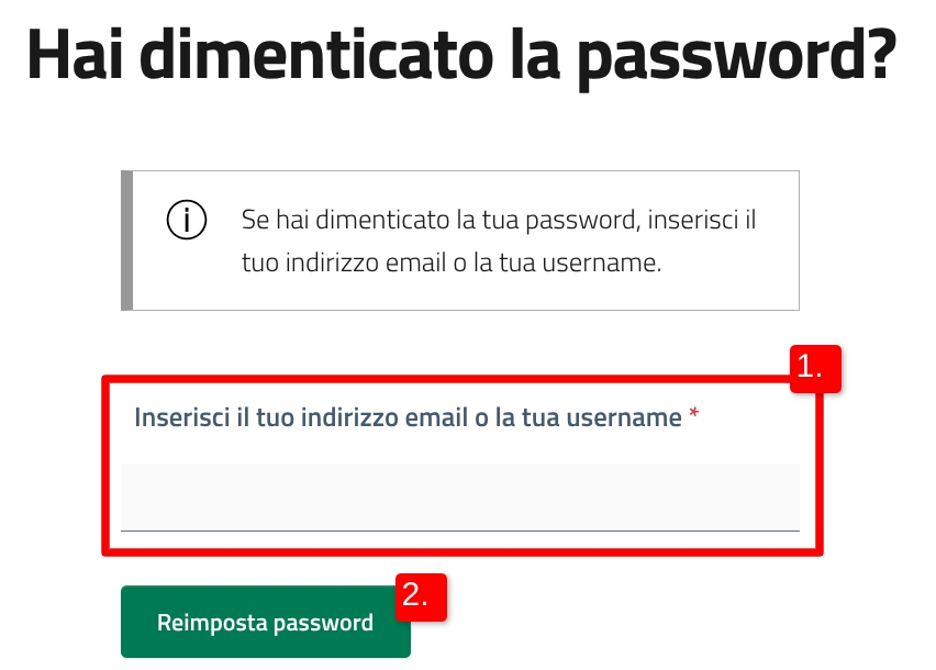 Qui l'operatore indica l'indirizzo mail associato al suo utente oppure il suo username (1) e poi clicca su "Reimposta password" (2).
