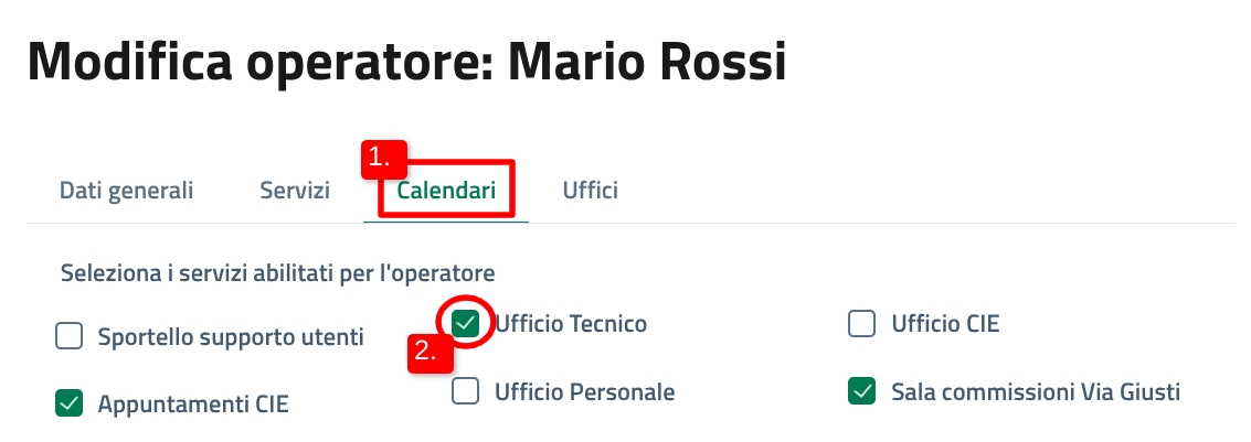 Successivamente, seleziona la sezione "Calendari" (1) e indica i calendari a cui abilitare l'operatore (2).