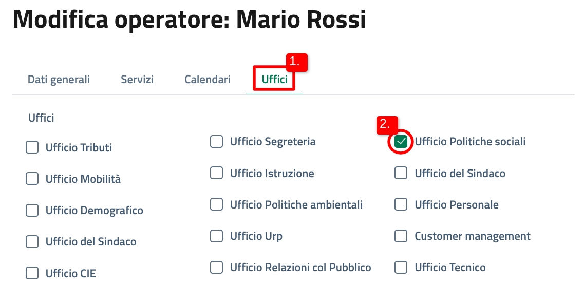 Successivamente, seleziona la sezione "Uffici" (1) e indica l'ufficio di appartenenza dell'operatore (2).